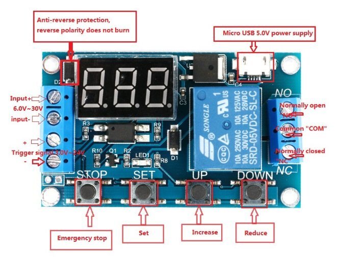 Zaman ayarlı tekli röle kartı, çok fonksiyonlu zaman geçikmeli röle kartıdır. Geniş besleme (6 ~ 30V) aralığı sayesinde birçok devreyle rahatlıkla kullanılabilir. Ayrıca Micro USB üzerinden de beslenebilmektedir. Bunların yanında kartın altında bulunan padlar üzerinden 5V ile de çalışabilmektedir. Çoklu zaman ayarlı Tekli röle kartıyla neredeyse aynı özelliklere sahiptir. Cihaz ara yüzü net ve basit, güçlü, anlaşılması kolay, hemen hemen tüm ihtiyaçlarınızı karşılamaktadır. Süre ayarlaması için 3 farklı format kullanılabilir. Bunlar 0.1-99.9 saniye(nokta ortada), 0-999 saniye (nokta sağda) ve 0-999 dakika(üç noktada aktif) şeklindedir. Ters polarite koruması ile bir anahtar durdurma fonksiyonu (STOP tuşu) vardır, ters polarite yanmaz.